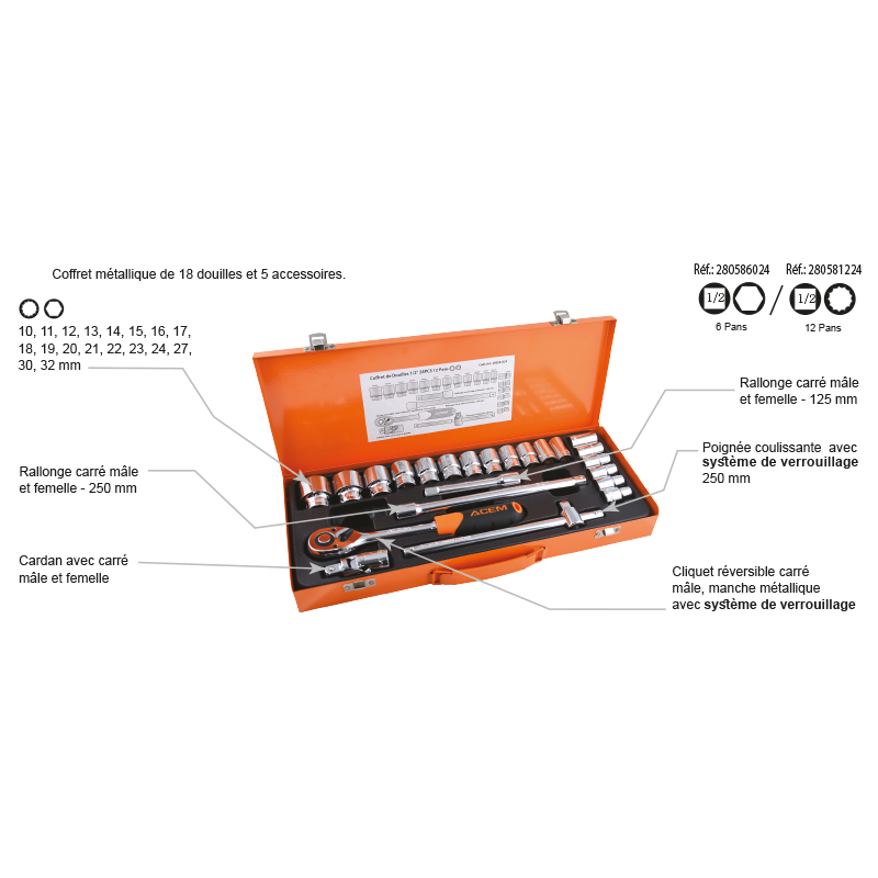 Douilles incluses : 10, 11, 12, 13, 14, 15, 16, 17, 18, 19, 20, 21, 22, 23, 24, 27, 30, 32 mm