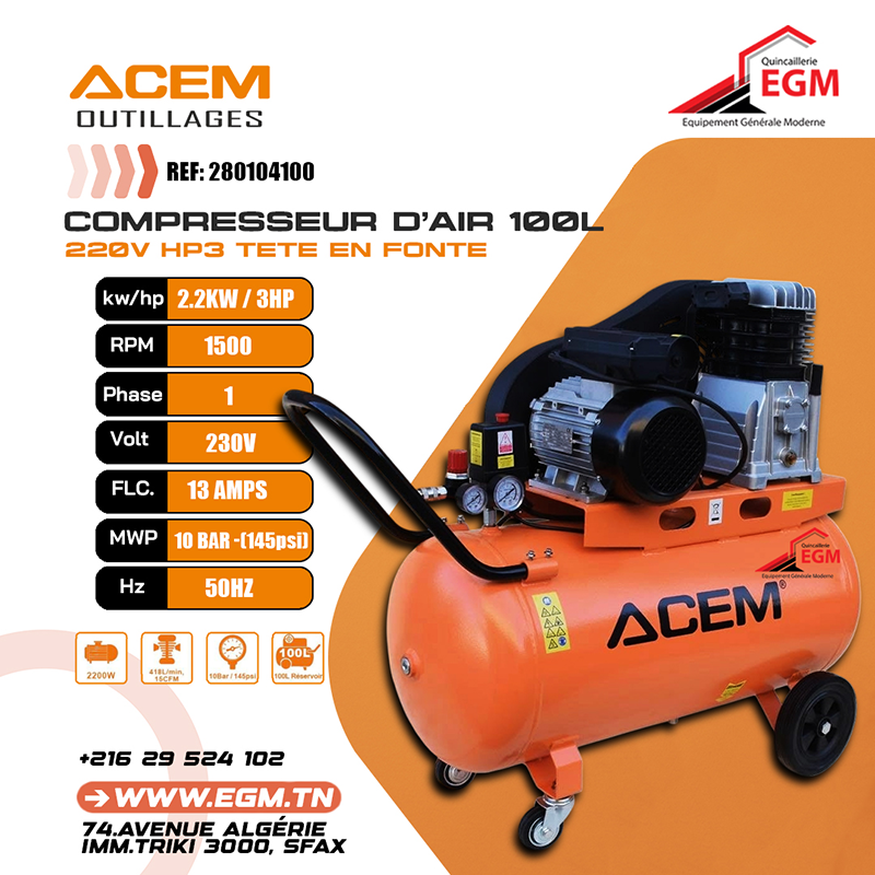 COMPRESSEUR AIR 100L 220V HP3 TETE EN FONTE ACEM