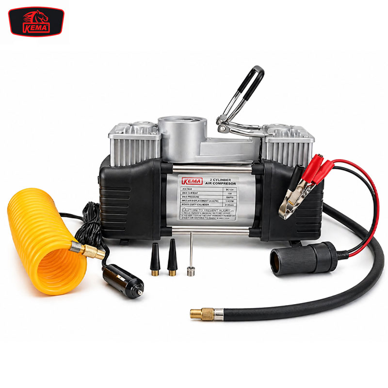 Compresseur portatif double cylindre KEMA 628-4X4, 12V, 18A, pression maximale 150 PSI. Idéal pour gonflage rapide des pneus voiture, 4x4, SUV, moto et accessoires gonflables. Livré avec flexible, pinces batterie et embouts de gonflage.