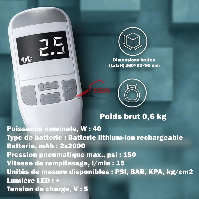 - Appareil multifonction 3 en 1 : cet appareil sert non seulement de compresseur de voiture sans fil, mais aussi de batterie externe et de lampe de poche LED. Grâce à sa batterie intégrée, le compresseur peut être utilisé indépendamment des sources d’alimentation externes et offre trois modes de pompage différents : auto – 2,5 bar, 3,1 bar (45 psi) moto – 4,1 bar (60 psi) équipement sportif – 0,5 bar (8 psi)