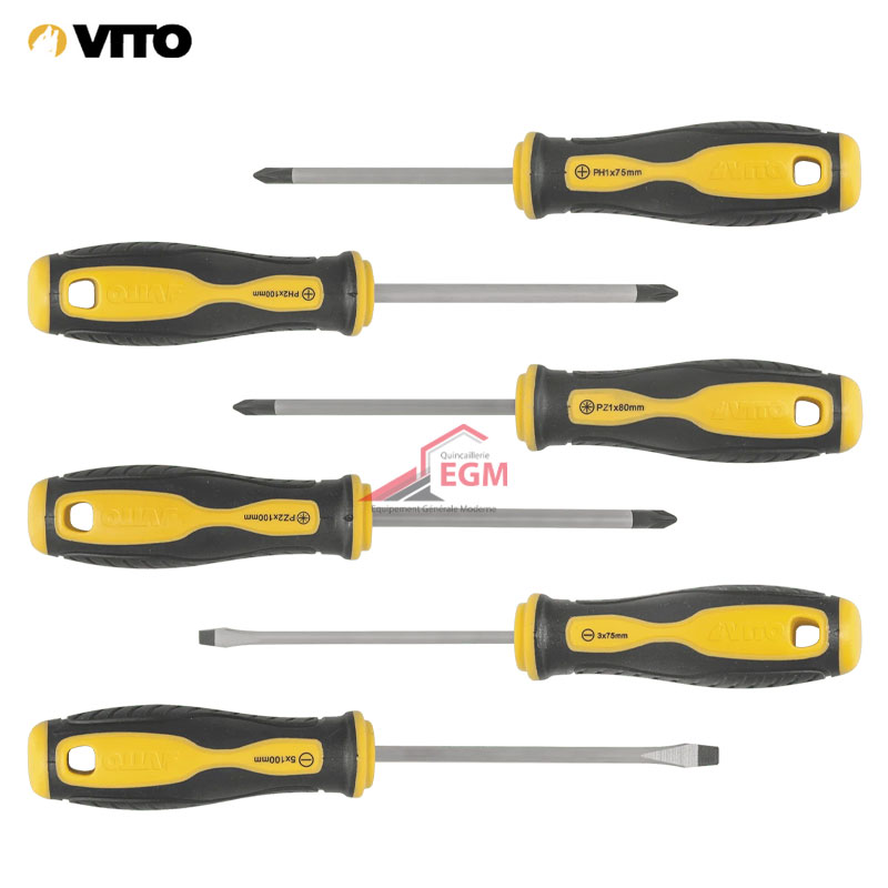 Référence : VICCPB6 Jeu de 6 tournevis mixtes Pro avec tige en acier chrome vanadium, pointe magnétique et manche bi-matière. 2 tournevis lame plate: 3 x 75 mm et 5 x 100 mm. 2 tournevis phillips: PH1 x 75 mm et PH2 x 100 mm. 2 tournevis pozidriv: PZ1 x 80 mm et PZ2 x 100 mm.