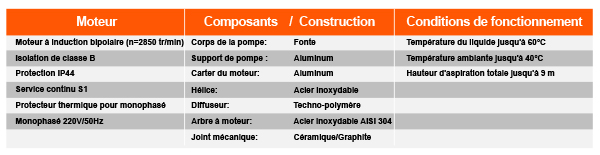 ■ Liquide pompé: propre, ne contenant pas de corps solides ou abrasifs, non visqueux, non agressif, non cristallisé et chimiquement neutre.