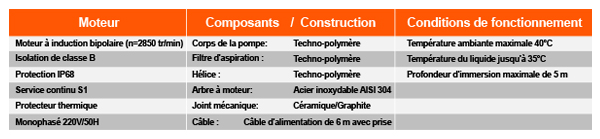 Pompe pour eaux usées domestiques (Ø 8 mm), fiable et facile à utiliser. Idéale pour évacuation et vidange. Aspiration 5 m, température max 35°C. IP68 – Classe B – Hélice techno-polymère