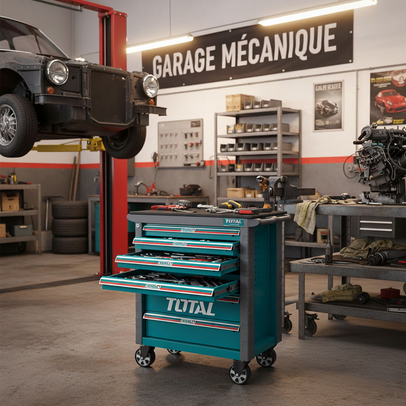 La Servante d’Atelier à 7 Tiroirs TOTAL est conçue pour les professionnels et passionnés de mécanique qui recherchent robustesse, organisation et mobilité. Avec sa structure métallique solide et ses 7 tiroirs spacieux, elle permet de ranger efficacement tous vos outils et accessoires. Équipée de roues pivotantes et d’un système de verrouillage centralisé, elle assure sécurité et praticité au quotidien. Un indispensable pour les ateliers et garages modernes.