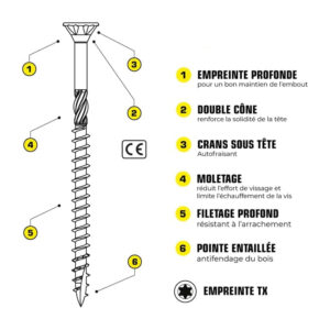 | 5.0 | 60 | Tête fraisée | Partiel / total | TX25 | Ossature bois, menuiserie extérieure |